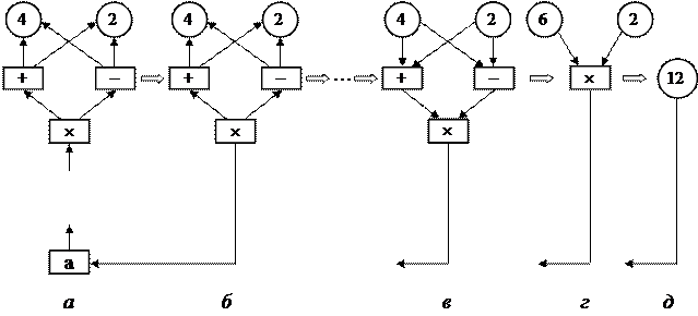 Рис. 14.17. Процесс вычислений в модели со строчной редукцией: а – исходный граф; б, в – последовательно редуцированные графы; г – результат редукции