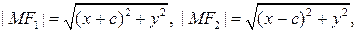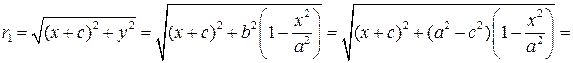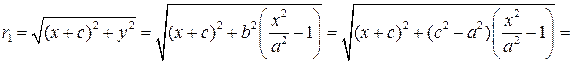 У гиперболы с каноническим уравнением (3) имеются фокусы, это две точки: и (рис.). Если – произвольная точка гиперболы, то отрезки и а также их длины называются фокальными радиусами точки Вычислим значения фокальных радиусов: