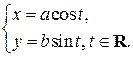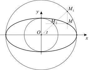 Пусть произвольное вещественное число. Из точки проведем луч, образующий угол с положительным направлением оси . Этот луч пересекает окружности в точках и . Через точку проведем прямую, параллельную оси , а через точку проведем прямую, параллельную оси . Эти прямые пересекаются в точке , которая, очевидно, лежит на эллипсе с уравнением (1). Если принимает все вещественные значения, то пробегает все точки эллипса, следовательно, параметрические уравнения эллипса имеют вид: