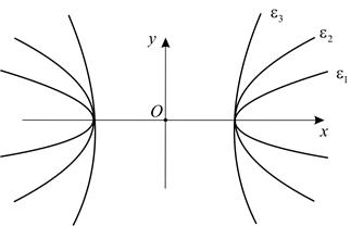 Определим число . Отношение , также как для эллипса, называется эксцентриситетом. Эксцентриситет гиперболы – положительное число, большее единицы, характеризующее ее форму (на рис. 6). Если стремится к 1, то мнимая полуось значительно меньше действительной полуоси и гипербола приближается к двум лучам. Если стремится к , то мнимая полуось значительно больше действительной полуоси и гипербола приближается к паре параллельных прямых.