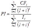 где CFt – денежный поток от реализации инвестиционного проекта (за вычетом инвестиционных затрат) на этапе t, It – инвестиционные затраты на этапе t, i – норма дисконта, n – общее число этапов в расчетном периоде. В случае единовременного вложения средств, предшествующего получению доходов от реализации инвестиционного проекта, индекс прибыльности определяется по формуле: