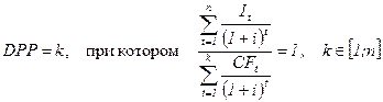 где I – единовременные инвестиционные затраты на реализацию проекта. В отличие от показателя NPV индекс прибыльности является относительным показателем. Благодаря этому он очень удобен при выборе одного проекта из ряда альтернативных. Большее значение PI для ряда альтернативных проектов, имеющих примерно одинаковые значения NPV, свидетельствует о большей эффективности инвестиционного проекта. Индекс прибыльности может быть использован и в качестве критерия принятия инвестиционного решения о возможностях реализации определенного проекта. В этом случае, если: · Р1 > 1, проект следует принять; · Р1 < 1, проект следует отвергнуть; · Р1 = 1, проект можно либо принять, либо отвергнуть. Данный метод аналогичен критерию срока окупаемости инвестиций (PP), но использует дисконтированные значения поступлений и затрат, связанных с реализацией инвестиционного проекта. Период окупаемости (DPP – discounted payback period) – период времени с начала финансирования инвестиционного проекта до момента, когда поток дисконтированных доходов по проекту станет равным дисконтированному потоку затрат. Расчет показателя DPP осуществляется по следующей формуле: