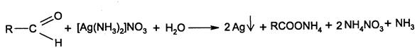 1. Реакция окисления. Альдегиды окисляются до карбоновых кислот с тем же числом атомов углерода, что и исходный альдегид. Окисление происходит даже под действием слабых окислителей: йода, растворов комплексных соединений серебра, меди, ртути в щелочной среде при нагревании. Ионы этих металлов восстанавливаются до свободных металлов или их оксидов, образуя окрашенные осадки, а раствор йода обесцвечивается. 1) Реакция с аммиачным раствором нитрата серебра (реакция серебряного зеркала):