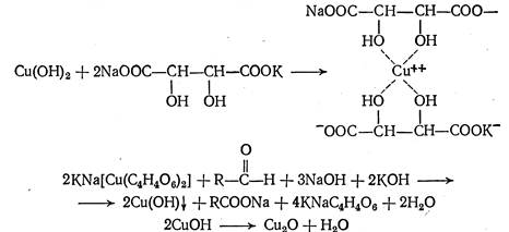 3) Реакция с реактивом Фелинга. Этот реактив представляет собой смесь двух отдельно приготовленных растворов: раствора меди сульфата и раствора соли винной кислоты и натрия гидроксида. При смешивании этих растворов с альдегидами после нагревания образуется вначале желтый осадок гидроксида меди (I), а затем кирпично-красный осадок оксида меди (I):