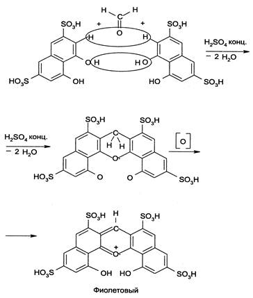 2. Реакции конденсации. 1) С фенолами. В присутствие концентрированной серной кислоты образуется бесцветный продукт конденсации при последующим окислении которого получаются интенсивно окрашенные соединения хиноидной структуры. В качестве реактивов используются салициловая кислота или хромотроповая (1,8-диоксинафталин-3,6-дисульфоновая кислота):