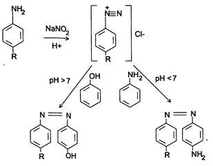 1. Реакция диазотирования с последующим азосочетанием. В основе реакции лежит взаимодействие соединений, содержащих Ar—NH2 с нитритом натрия в кислой среде. В результате образуются бесцветные или слабо-желтого цвета соли диазония. Исключение составляет этакридина лактат, в результате диазотирования которого образуется диазосоединение, имеющее вишнево-красную окраску. Получение диазосоединения сочетают с фенолами (β-нафтолом, фенолом, резорцином) в щелочной среде или ароматическими аминами в кислой среде. При этом образуются азокрасители.