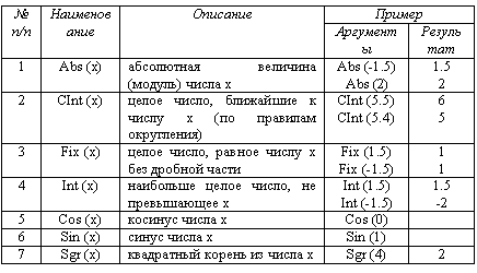 Loop Форма записи: Do While условие Тело цикла Условие выхода из цикла можно поставить конце, после тела цикла. Такой цикл будет называться цикл с постусловием. ВСТРОЕННЫЕ ФУНКЦИИ Функция вычисляет и возвращает результат в зависимости от исходных данных (аргументов). Например: Sin(x) Общий вид функции: Имя функции (аргумент_1, аргумент_2, аргумент_n) Имена функций составляются по тем же правилам, что и имена переменных. Функция может иметь один или несколько аргументов. Функции могут использоваться в арифметических выражениях с оператором присваивания, например: