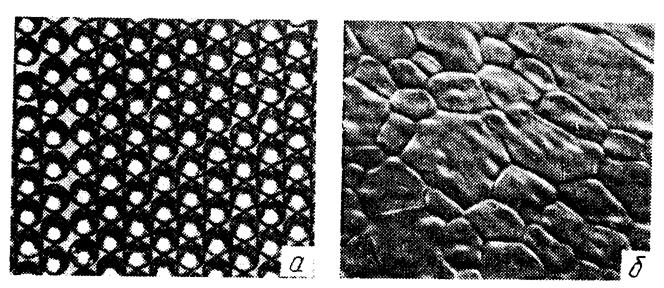 Рис. 5. Внешний вид (а) и рельеф поверхности (б) сферических частиц из UO2.