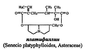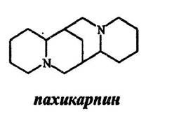 • Тропановые алкалоиды: - гиосциамин - сложный эфир спирта тропина и троповой кислоты (Atropabelladonna, A.caucasica, Hyoscyamus niger, Datura stramonium, Solanaceae); - скополамин (окисленная форма гиосциамина) - сложный эфир спиртаскопила и троповой кислоты (Datura innoxia, Scopoiia carniolica, Solanaceae) - • Хинолизидиновые алкалоиды - два конденсированных кольца пиперидина имеющие общий атом азота • • пахикарпин (Thermopsis lanceolata, Sophorapachycarpa, Fabaceae) • цитизин (Thermopsis lanceolata, Th.alterniflora,Fabaceae) • нуфлеин (Nuphar luthea, Nympheaceae)
