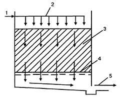 Рис. 2. Схема биофильтра: 1 - подача СВ; 2 - распределитель СВ; З - загрузочный материал; 4 - поддерживающая решетка; 5 - отведение очищенных СВ