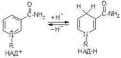 в) присоединение гидрид-иона Соли пиридиния присоединяют гидрид-ион, образуя восстановленную форму хиноидной структуры, эта реакция обратима. Такие превращения происходят при функционировании пиридиннуклеотидных коферментов НАД и НАДФ: