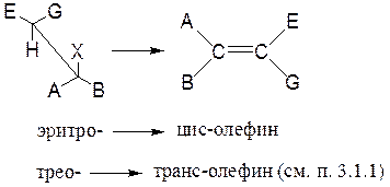 Независимо от геометрии исходного соединения, благодаря свободному вращению в карбокатионе, он принимает наиболее устойчивую конформацию с наименьшими стерическими затруднениями между G—Е и А—В. Из этой конформации и будет образовываться двойная связь (олефин). Значит, стереоспецифичность при таком элиминировании отсутствует, но оно может быть более или менее стереоселективным.
