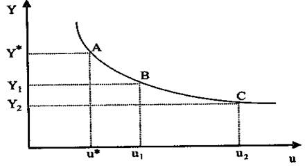 Y – обсяг виробництва; U – природний рівень безробіття; т. А – повна зайнятість.