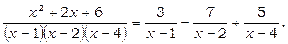 Невідомі А, В, С у розкладанні можна було визначити й інакше. Після звільнення від знаменника можна надати х стільки часткових значень, скільки є в системі невідомих, у даному випадку – три часткових значення. Особливо зручно надати х значення, що є дійсними коренями знаменника. Застосуємо цей прийом до розв’язання даної задачі. Після звільнення від знаменника ми одержали рівність (*). Дійсними коренями знаменника є числа 1, 2, і 4. Покладемо в цій рівності х =1, тоді