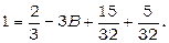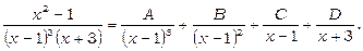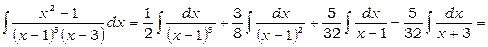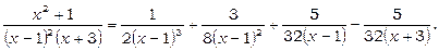 Дійсними коренями знаменника є числа 1 та -3. Вважаючи х =1, одержуємо 2=4 А, тобто А =1/2. При х =-3 маємо 10=-64 D, тобто D =-5/32. Порівняємо коефіцієнти при старшому ступені х, тобто при х 3. У лівій частині немає члена з х 3, тобто коефіцієнт при х 3 дорівнює 0. У правій частині коефіцієнт при х 3 дорівнює C+D. Отже, C+D =0, звідки С =5/32. Залишається визначити коефіцієнт В. Для цього необхідно мати ще одне рівняння. Це рівняння можна одержати шляхом порівняння коефіцієнтів при однакових ступенях х (наприклад, при х 2) або надавши х яке-небудь числове значення. Зручніше взяти таке значення, при якому обчислень буде якомога менше. Покладемо, наприклад, х =0, одержуємо