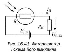 Фоторезистор — напівпровідниковий прилад з внутрішнім фотоефектом, електричний опір якого змінюється під впливом оптичного випромінювання. Вмикається в коло джерела ЕРС (рис. 16.41) послідовно з опором навантаження. За відсутністю освітлення має максимальний опір, що названо темновим. Струм у колі:
