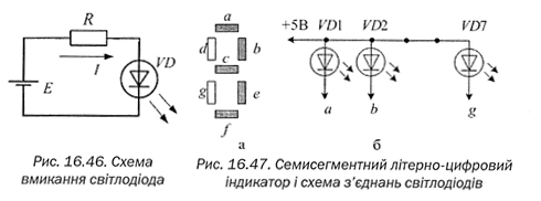 Фототиристор — тиристор, напруга вмикання якого зменшується із збільшенням освітлюваності (рис. 16.45). Є аналогом керованого тиристора, вмикання якого можна виконати імпульсом світла. Широко використовуються в схемах автоматики в ролі керованих світлом ключових елементів — реле, а також у силовій перетворювальній техніці, де використання їх натомість звичайних тиристорів спрощує вирішення питання електричної ізоляції кіл керування від силових кіл високої напруги, що комутуються. Світлодіод — випромінювальний напівпровідниковий прилад, у якому при наявності прямого струму ІПР відбувається світіння зони р-п переходу (рис. 16.46). Чим більший струм, тим більше світіння. Виготовляють світлодіоди на основі арсеніду-фосфіду галію. Світлодіоди можуть мати один, або декілька р-п переходів (матричні світлодіоди), що розташовані на одному кристалі. При відповідному вмиканні окремих р-п переходів матричного світло діода можна отримати цифру, букву або знак, що сяють. Використовують також збірки світлодіодів в одному корпусі, де цифра, або літера створюється висвітлюванням визначеної комбінації сегментів — світлодіодів при проходженні ними прямого струму (рис. 16.47). Для цього катоди діодів-сегментів (а, Ь, с,...g) необхідно з'єднати з негативним виводом джерела через резистори, що обмежують струм. На основі світлодіодів та їхніх збірок (матриць) утворюються різні індикаторні прилади — пристрої візуального відображення інформації від простого, де сяйво є свідоцтвом про стан об'єкта (увімкнено-вимкнено), до літерно-цифрових і матричних дисплеїв у цифрових системах опрацьовування інформації.