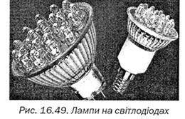 На основі надяскравих світлодіодів створюються енергозберігаючі лампи (рис. 16.49) з терміном служби 50 тис. годин (10 років) та кольорами світіння (по вибору) білим, зеленим, червоним, жовтим, блакитним; лампи можуть відрізняться одна від одної кількістю світлодіодів (від 5 до 60), типом цоколю та напругою живлення: 220 або 12 В, їхня споживана потужність від 0,5 до 10 Вт. Оптрони — прилади, що складаються (рис. 16.50) з випромінювача світла —1, світловода — 2 і фотоприймача — 3, що взаємодіють один з одним і розташовані в одному корпусі. У цьому випадку сигнал з одного електричного кола (випромінювача) передається в друге електричне коло
