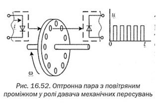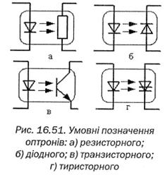 (приймача) при відсутності між ними електричного зв'язку (гальванічне розв'язування). В залежності від типу фотоприймача розрізнюють: резисторні (рис. 16.51, а), діодні (рис. 16.51, б), транзисторні (рис. 16.51, в) і тиристорні (рис. 16.51, г) оптрони. Найбільш універсальні діодні оптрони використовують для гальванічного розв'язування швидкодіючих цифрових пристроїв. Транзисторні і тиристорні оптрони широко використовують в якості безконтактних комутаторів силових кіл (оптичні перемикачі — реле), резисторні — в лінійних радіотехнічних колах (оптично керовані резистори). Оптоелектронні пари з повітряним проміжком між випромінювачем і фотоприймачем застосовують для рахування інформації з перфоносіїв, а також давачів механічних параметрів: пересувань, швидкості (рис. 16.52).