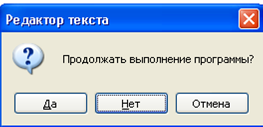 Ниже приведен пример вызова окна сообщений с данным набором параметров: MessageBox.Show("Продолжать выполнение программы?", "Редактор текста", MessageBoxButtons.YesNoCancel, MessageBoxIcon.Question, MessageBoxDefaultButton.Button2);