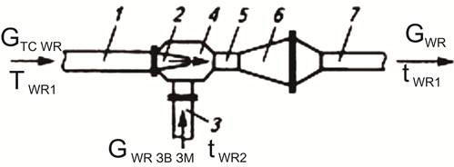 Із приєднаного до лінії 1 теплової мережі трубопроводу, що подає теплоносій, до конічного сопла 2 елеватора надходить гаряча мережна вода в кількості GТС WR і температурою TWR1. При виході з високою швидкістю через сопло 2 мережної води довкола неї створюється розрідження й виникає ефект ежекції, при цьому в камеру змішування елеватора 4 через трубопровід 3 підсмоктується зворотна вода із системи опалення в кількості GWR ЗВ ЗМ із температурою tWR2, при цьому відбувається перемішування цих потоків. У горловині елеватора 5 протікає вирівнювання параметрів суміші потоку води GWR. У дифузорі 6 завдяки збільшенню по ходу потоку площі поперечного перерізу швидкість і гідродинамічний тиск падають, але при цьому зростає гідростатичний тиск. Завдяки різниці гідростатичних тисків наприкінці дифузора 6 і трубопроводі усмоктування 3 створюється циркуляційний напір для роботи системи опалення.