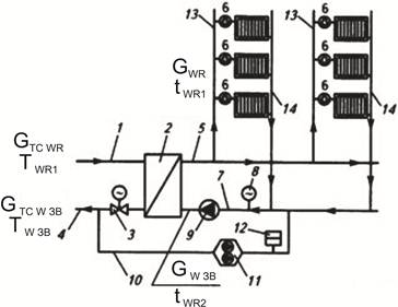 Трубопровід 1, що подає теплоносій від тепломережі, приєднаний до водо-водяного пластинчастого теплообмінника 2. Через стінки гофрованих пластинчастих каналів теплота від гарячої мережної води (первинної) GTC WR передається на нагрівання (вторинної) води GWR, що циркулює по системі опалення будинку від роботи циркуляційного насоса 9. Для економії електроенергії раціонально застосувати насос 9 з електронним регулюванням частоти обертання електродвигуна за датчиками виміру перепаду тиску в подавальному 5 і зворотному 7 трубопроводах системи опалення. Для економії теплоти на опалення приміщень у нагрівальних приладів є терморегулятори 6, що змінюють витрату гарячої води залежно від контрольованого значення температури повітря в приміщенні. Зміна витрати води через опалювальний прилад з терморегулятором 6 підвищує тиск води в трубопроводі, що подає, 5. Підвищення тиску води в трубопроводі 13 перед терморегуляторами 6 опалювальних приладів у приміщеннях, де тепловий режим відповідає умовам теплового комфорту, приведе до зростання проходу гарячої води в опалювальні прилади в цих приміщеннях. Відповідно температура повітря в цих приміщеннях підвищиться вище комфортного рівня. Відбудеться перегрівання приміщення й перевитрати теплоти. Для запобігання перевитрат теплоти й порушення комфортного теплового режиму в приміщеннях у подавальному 5 і зворотному 7 трубопроводах зберігається постійний тиск завдяки застосуванню насоса 9 з електронним автоматичним регулюванням. Початкову температуру води tWR1 енергетично раціонально знижувати з підвищенням температури зовнішнього повітря, що досягається регулятором, що контролює температуру зовнішнього повітря й температуру зворотної води TW ЗВ у зворотному трубопроводі 4 тепломережі, впливом на автоматичний клапан 3. У процесі експлуатації системи опалення можливі витоки циркулюючої води. Зниження рівня води у верхній частині системи опалення контролюється датчиком, пов'язаним з автоматичним пристроєм у герметичному баку 12. При зниженні рівня води, у системі опалення нижче контрольованого рівня автоматичний регулятор у баку 12 включає в роботу один зі здвоєних насосів 11, при роботі якого в систему опалення по з’єднувальному трубопроводу 10 буде додаватися мережна хімічно підготовлена вода із системи теплопостачання. При підвищенні рівня води в системі опалення до верхнього контрольованого рівня від регулятора в баку 12 піде команда на зупинку живільного насоса 11. Представлена схема циркуляції води в системі опалення називається двотрубною з нижнім горизонтальним розведенням магістральних подавальних 5 і зворотних 7 трубопроводів і вертикальними подавальними 13 і зворотними 14 стояками. Вертикальне розташування стояків при нижньому розміщенні магістральних трубопроводів вимагає наявність повітровідвідників у верхніх точках стояків. Повітровідвідники можуть бути виконані у формі спускних кранів ручного керування або автоматичні повітровідвідники.