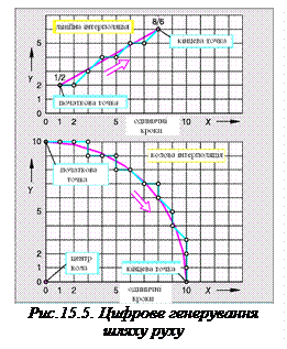 Для опису руху центральної точки робочого інструменту TCP (aнгл. Tool Center Point) необхідно, виходячи з його дійсного положення на шляху руху, подати координати наступного пункту шляху, як спосіб переходу (траєкторію пересування) до цього пункту. Числове керування мусить також швидко визначити проміжні пункти цього пересування - в цьому випадку ми говоримо саме про інтерполяцію (рис. 15.4). Розрізняють: · лінійна інтерполяція – для лінійних переміщень, · колова інтерполяція – для переміщень по дугах кола, · інтерполяція типу сплайн – для переміщень по гладких шляхах, · параболічна інтерполяція – для переміщень по відрізках параболи, · спіральна інтерполяція – для переміщень по гвинтовій лінії.