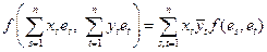 1. Функции, для которых выполнены условия 1, 2 из определения и 1, 2 из следствия называются полуторалинейными (они линейны по первому аргументу и полулинейны по второму). Таким образом, любая эрмитова функция - полуторалинейная. 2. Теория эрмитовых функций аналогична теории симметричных билинейных функций, поэтому многие утверждения будут лишь сформулированы, а их доказательства читателю предлагается провести в качестве упражнений. Примером эрмитовой функции служит скалярное произведение на унитарном пространстве. Пусть f - полуторалинейная функция на n -мерном пространстве L = Ln над полем С, e = {e1, …,en} – произвольный базис в L. Если x, yÎ L, xs, ytÎ С, то f(x,y) = этой формулы видно, что значение полуторалинейной функции f(x, y) при произвольных x, yÎ L полностью и однозначно определяется n2 значениями fst = f(es,et) функции f на упорядоченных парах базисных векторов es, et. Матрицу [ Пусть Определение. Пусть f - полуторалинейная функция на линейном пространстве L над С. Функция F: L ® С, заданная формулой F(x) = f(x, x) " x Î L, называется квадратичной функцией, определяемой полуторалинейной функцией f. Если f – эрмитова, то и F называется эрмитовой. Очевидно, если f(x, y) = форма второй степени от действительных и мнимых частей координат х. Матрицей квадратичной формы F будем называть матрицу соответствующей полуторалинейной формы f: [ Упражнение. Проверить, что полуторалинейная форма f однозначно восстанавливается из определенной ею квадратичной формы F по формуле f(x, y)= Если e ¢ = {e¢1,…,e¢n} - другой базис в L, и Т =