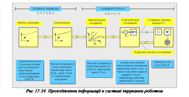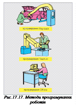 Методи програмування Програмування роботів є набагато важчим, ніж програмування машин з числовим керуванням, бо, крім траєкторії руху, потрібно також запрограмувати положення (орієнтацію) інструменту або тримача. Як правило, це завдання, наприклад, орієнтування пальника під час укладання з’єднання криволінійної частини рейкового розгалуження, не можна виконати лише на основі технічного креслення деталей. Методи, які використовуються для програмування роботів: метод Play-back (або програмування за допомогою обведення траси руху), метод Teach-in (програмування координат точок траси руху)і програмування Off-line, а також інтерактивне графічне програмування (рис.17.17).