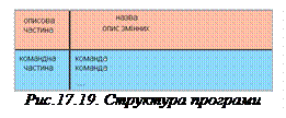 В головній програмі визначаються всі важливі в загальному параметри і операції робота, наприклад, максимальна швидкість, максимальне прискорення, нульова точка, система координат, стартове положення. В підпрограмах описуються окремі завдання з усіма даними про положення і орієнтацію інструмента. Опитуються входи і встановлюються виходи керування. Всі програми чітко поділяються на описову та командну частини(рис.17.19 i табл.17.1). В описовій частині дається назва програми, в головній програмі – назви глобальних підпрограм і прийняті змінні. В командній частині приводяться команди для виконання. Глобальні підпрограми діють під час виконання всієї програми, тоді як локальні – лише в відокремлених кроках програми.