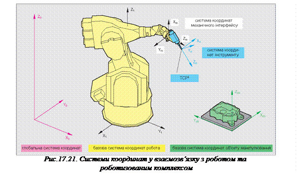 Базова система координат маніпульованого чи оброблюваного об’єкту визначає його положення (рис.17.23). Вона тісно пов’язана з глобальною системою координат. В цій системі координат відбувається програмування О ff-line маніпуляційних завдань. Осі системи найчастіше відповідають осям положення стола машини або осям місця накопичення палет. Система координат маніпульованого об’єкту