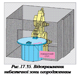 Безумовно, що місце роботи робота, зважаючи на швидкі рухи його плеча, є зоною небезпеки і повинне бути відокремлене від шляхів внутрішнього транспорту і місць роботи людей. Найнадійніше таке відокремлення забезпечує огородження з міцної металевої сітки (рис. 17.35), яка охороняє також від небезпеки перешкод в роботі схоплювача та від викидання ним при швидких рухах робота транспортованих предметів. У випадку ручного постачання деталей до роботизованого місця доцільно це робити за допомогою поворотного стола (рис.17.35). • Перед початком і при роботі робота захисні пристрої обов’язково мусять бути ввімкнені. • При усунених або пошкоджених охоронних пристроях робот безумовно має бути зупинений.