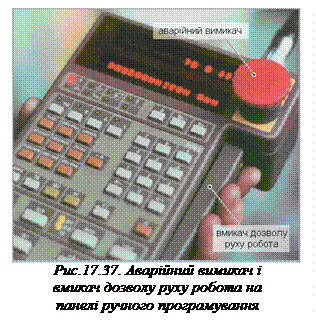 Переносна панель програмування повинна мати такі зони • аварійний вимикач (рис.17.37), • вмикач дозволу руху робота (рис.17.37).