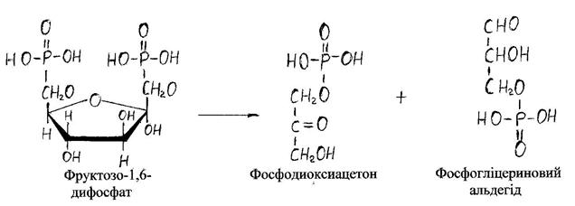 2. Утворений глюкозо-6-фосфат піддається ізомеризації під дією ферменту глюкозо-фосфат-ізомерази у фруктозо-6-фосфат. 3. Утфорений фруктозо-6-фосфат далі фосфорилюється за рахунок АТФ з участю ферменту фосфофруктокінази, утворюється фруктозо-1,6-дифосфат. Цимзакінчується підготовча стадія анаеробного (і аеробного) розщеплення цукрів. 4. На слідуючій стадії фруктозо-1,6-дифосфат розпадається на молекули фосфотріоз: фосфогліцериновий альдегід і фосфодиоксиацетон з участю ферменту альдолази.