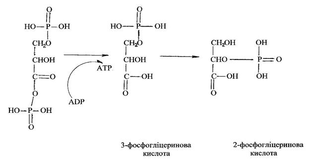 8. Під дією ферменту фосфогліцеромутази 3-фосфогліцеринова кислота перетворюється в 2-фосфогліцерин. 9. Утворена кислота під дією ферменту енолази (фосфопіруватгідратази) перетворюється в фосфоенолпіровиноградну кислоту. 10. Під дією фосфотрансферази (пірувафосфокінази) та перетворюється в енолпіровиноградну кислоту, яка швидко переходить в більш стійку кето-форму піровиноградної кислоти.