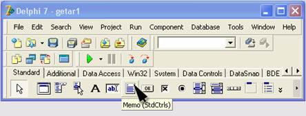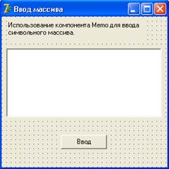 В деяких випадках для введення масиву можна використовувати компонент Memo. Компонент Memo дозволяє вводити текст, що складається з достатньо великої кількості рядків, тому його зручно використовувати для введення символьного масиву. Компонент Memo додається у форму звичайним способом. Значок компоненту знаходиться на вкладці Standard (рис. 4).