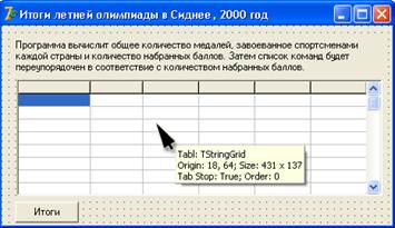 Осередки першого зафіксованого рядка таблиці використовуються як заголовки колонок таблиці. Під час створення форми застосування не можна встановити значення елементів масиву cells, оскільки елементи масиву доступні тільки під час роботи програми. Тому значення елементів масиву Сells, відповідних першому рядку таблиці, встановлює процедура обробки події OnActivate (її текст приведений в лістингу 6), яка відбувається під час активізації форми застосування. Крім того, ця процедура вписує в першу колонку таблиці назви країн-учасниць змагань. Лістинг 6. Ініціалізація таблиці procedure TForml.FormActivate(Sender: TObject); begin tabl.Cells[0,0]:='Страна'; tabl.Cells[1,0]:='Золотых'; tabl.Cells[2,0]:='Серебряных'; tabl.Cells[3,0]:='Бронзовых'; tabl.Cells[4,0]:='Bcero'; tabl.Cells[5,0]:='Баллов'; tabl.Cells[0,1]:='Австралия'; tabl.Cells[0,2]:='Белоруссия'; tabl.Cells[0,3]: ='Великобритания'; tabl.Cells[0,4]:='Германия'; tabl.Cells[0,5]:='Италия'; tabl.Cells[0,6]:='Китай'; tabl.Cells[0,7]:='Корея'; tabl.Cells[0,8]:='Куба'; tabl.Cells[0,9]:='Нидерланды'; tabl.Cells[0,10]:= 'Росія'; tabl.Cells[0,ll]:='США'; tabl,Cells[0,12]:='Франция'; tabl.Cells[0,13]:='Япония'; end;