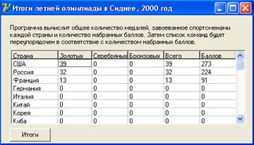 Програма повинна обчислити загальну кількість медалей, завойованих представниками кожної країни, і відповідну кількість очок (балів), яка обчислюється за наступним правилом: за кожну золоту медаль команда одержує сім очок, за срібну — шість очок, за бронзову — п'ять очок. Вид діалогового вікна програми приведений на рис. 8.