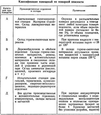 По пожежній небезпеці виробничі і складські приміщення авторемонтних підприємств діляться на п'ять категорій, вказаних табл. 54.