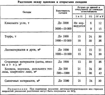 Протипожежні вимоги. Найменші допустимі відстані між будівлями і спорудами залежать від їх вогнестійкості. По межі вогнестійкості окремих частин будівлі і споруди розділяються на п'ять ступенів (табл. 53).