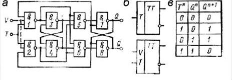 Рис 3.9 Т-триггер (TV-триггер при наличии V-входа): а – функциональная схема; б – условные обозначения; в – таблица состояний Разновидностью Т-триггера является ТV-триггер, имеющий дополнительный управляющий вход V (на рис. 3.9, а показан пунктиром). При сигнале V = 1 TV-триггер работает по правилам T-триггера. При сигнале V = 0 триггер сохраняет свое состояние неизменным.