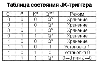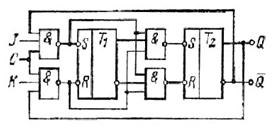 JK-триггер имеет два информационных входа: J и К, а также вход для тактовых импульсов С. Правило работы JК-триггера определяется исходя из табл. 3.4 JК-триггер отличается от синхронного RS-триггера тем, что, во-первых, не имеет запрещенных входных комбинаций и, во-вторых, при комбинации J = K = 1 изменяет свое состояние на противоположное, т. е. работает в режиме Распространенный вариант реализации JК-триггера представлен на рис. 3.11. Нетрудно видеть, что при сигнале С = 1, когда информационные сигналы устанавливают состояние первой ступени, вторая ступень блокирована. При сигнале С = 0, когда первая ступень закрыта для входной информации, вторая ступень, напротив, открывается и воспринимает состояние первой ступени. Примером может служить JК-триггер К155ТВ1, выполненный по рассмотренной схеме. Таблица 3.4