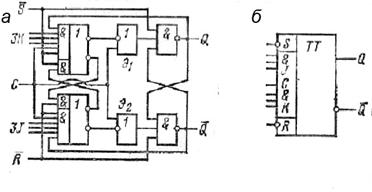 Обычно триггеры имеют один или два установочных входа, которые предназначены для установки триггера в требуемое начальное состояние. Установка осуществляется сигналами, которые поступают, как показано на Триггеры с установочными входами принято называть комбинированными DRS-RSТ-JКRS-триггерами. Часто встречаются триггеры с входной логикой. Примером может служить JК-триггер на рис. 3.11, a. Он имеет по три конъюнктивно связанных входа J и входа К, т. е. в его структуру встроены логические элементы. Такие триггеры необходимы для построения счетчиков с параллельным переносом. На основе JК-триггера можно с помощью внешних соединений его выводов (рис. 3.12) получить триггеры других видов. В этом смысле JК-триггер называют универсальным.