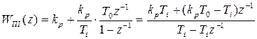 Аналогічно можна записати z-передавальні функції П-регулятора: Wп(z) = kп, І-регулятора: Wi(z) = Якщо ставити задачу синтезу цифрового ПІД-регулятора за його неперервним прототипом, то потрібно неперервну лінійну ланку Розглянемо дискретні аналоги інтегральної ланки Wi(z), які отримані різними методами інтегрування: – метод відстаючих прямокутників: – метод випереджуючих прямокутників: – метод трапецій з ідеальним екстраполятором: Наприклад, дискретний аналог неперервного ПІ-регулятора