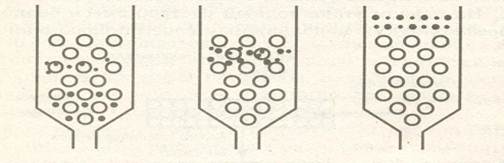 Хроматография БАВ с помощью ионообменных сорбентов, называемая ионообменной, является одним из методов разделения, имеющих наибольшую продолжительную историю развития. В настоящее время промышленная ионообменная хроматография стала одной из важнейших технологических стадий получения коммерчески значимых количеств БАВ. В основе ионообменной хроматографии лежит реакция обмена между неподвижным твердым ионообменным сорбентом и растворенным в растворителе веществом. Гель-фильтрация, или хроматография на молекулярных ситах, позволяет разделять вещества с различными молекулярными массами. В этом случае насадка колонки состоит из частиц геля с определенным диаметром пор. Если размер молекул больше диаметра пор, то они не могут диффундировать в гель и быстро проходят через колонку, тогда как молекулы меньшего размера проникают в гель и поэтому движутся более медленно (рис. 8.2).