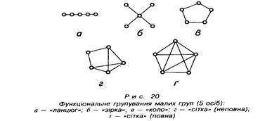 Повна комунікативна структура («сітка») забезпечує вільне спілкування між членами групи. Структура типу «зірка» характерна для груп, що працюють в умовах жорсткого керівництва, виконання управлінських функцій тільки самим керівником, а типу «ланцюг» і «коло» — виникають за конвеєрної праці. При цьому нескладні завдання краще вирішує група з комунікаціями централізованого типу, а у вирішенні складних завдань більш ефективною є повна «сітка» комунікацій. 5.4. Застосування різних систем комунікацій сприяє поширенню інформації від одних членів групи до інших і забезпечує ефективність виконання завдань. Для цих систем характерні різні форми спілкування: дискусія, консиліум, конструктивне сперечання, консультування. В організації творчої дискусії слід усіма засобами запобігати центрації комунікативних зв'язків. Ніхто з членів групи не повинен мати ні просторових, ні комунікативних, ні інформаційних переваг. Розташування учасників дискусії у просторі має бути вільним (наприклад по колу) і залежати тільки від надання особистісних переваг, а інформаційний обмін за схемою — повна чи неповна «сітка». Консиліум як форма групової діяльності використовується у вирішенні професійних проблем групою спеціалістів. У цих випадках спільна робота фахівців завжди спрямована на результат. Процедурно нарада (консиліум) допускає відкритий обмін думками і оцінками, але тільки до моменту прийняття конкретного рішення. Консиліум може розгортатися за двома основними схемами, перша з яких передбачає створення умов для кооперації дій членів групи. Це інструктивне орієнтування на підтримку інтересів, ідей і гіпотез один одного та позитивне ставлення до них. Друга — потребує створення умов для розгортання конкуренції серед членів групи, яка базується на розробці різних варіантів рішення проблеми. Для виявлення позитивних і негативних сторін конкуруючих варіантів застосовують таку форму спілкування, як конструктивне сперечання. Конструктивне сперечання — це свідоме і певним чином організоване виявлення переваг і недоліків конкурентоспроможних варіантів вирішення проблеми. Якщо метою дискусії групової діяльності є вироблення максимальної кількості різних рішень проблеми, то метою конструктивного сперечання є визначення найефективнішого варіанта рішення. При цьому доцільність того чи того варіанта має бути доведена з різних точок зору чи за кооперативною або за конкурентною схемою у вигляді конструктивного сперечання. Конструктивне сперечання має три чітко визначені фази, завдяки чому спільна діяльність більш регульована, ніж у дискусії. Перша фаза передбачає чітке визначення проблеми вибору одного з варіантів рішення, тобто за якими параметрами і характеристиками оцінюється кожне рішення. Друга фаза потребує дотримання етики сперечання — обговорювання тільки питань, які стосуються проблеми. Обов'язкова умова цієї фази — це реагування на всі «за» і «проти» варіантів, що розглядаються, за відхиленням від проблеми стежить керівник-арбітр сперечання. Третя фаза — завершальна, на якій приймається рішення з проблеми. Остаточним рішенням може бути або один із пропонованих варіантів, або компромісне рішення, або ніяке. У випадках збільшення протиріч і затягування другої фази керівник-арбітр змінює режисуру сперечання, наці