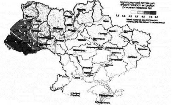 де х — значення К. Карта біотичного потенціалу природного середовища України є синтетичною за змістом. Синтетичний показник картографування розрахований за кількома величинами згідно з наведеною формулою. Вихідна інформація знята з опублікованих кліматичних карт за інформаційною сіткою, розробленою для карт кліматопогодних умов. Синтетична інформація між точками інформаційної сітки інтерполювалася способом ізоліній з урахуванням форм рельєфу. Найвищий біотичний потенціал природного середовища спостерігається в Карпатах, Прикарпатті, Закарпатті, Поліссі, а також у Кримських горах (рис. 13.3).