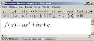 До складу програм Мiсrosoft Office входить спеціальна програма "Редактор формул", що призначена для набирання математичних формул. Щоб вставити в текст формулу, треба виконати команду Вставка – Текст –Вставка обьекта - Обьект. Потім у діалоговому вікні цієї команди слід вибрати параметр "Microsoft Equation 3.0" і натиснути кнопку "ОК". Після цього в тексті з'явиться прямокутник для введення формул і спеціальна панель інструментів "Формула" з двома рядами кнопок. Верхній рядок призначений для введення математичних символів, нижній містить шаблони елементів математичних формул, наприклад шаблони для верхніх і нижніх індексів