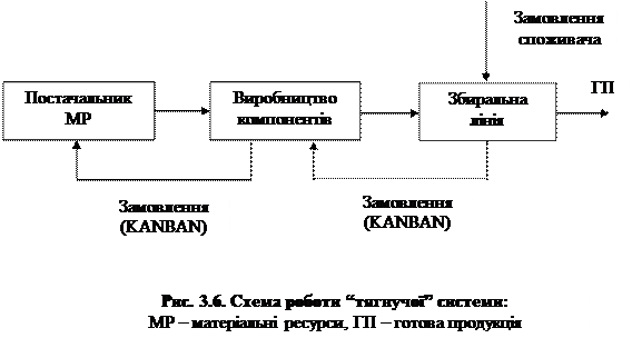 Як видно із порівняння схем в табл.3.4, усунення “некорисних” операцій, таких, як складування та чекання у виробничому циклі, приводить до суттєвого скорочення непродуктивних витрат і тривалості виробничого періоду. Ще одним із принципів систем “маловитратного виробництва” є принцип “тягнучих” систем, який ми вже частково розглянули вище. Щодо даної концепції згаданий принцип означає: відсутність складів, лише мінімальні запаси на полицях, всі запаси – на робочих місцях, тобто слід використовувати лише ті компоненти, які необхідні для задоволення замовлення споживача. У подібних системах зменшення запасів готової продукції, викликане ринковим попитом, автоматично генерує диспетчеризацію замовлень для виробничих ділянок. Це, у свою чергу, активізує ланцюг замовлень зворотного зв’язку від внутрішніх постачальників, і врешті-решт замовлення доходить до зовнішнього постачальника. Схема, яка ілюструє метод “тягнучої” системи, наведена на рис. 3.6. Розглянуті приклади основних мікрологістичних концепцій і систем, звичайно, не вичерпують всієї їх різноманітності. У західній економічній літературі дослідженню подібних систем присвячена велика кількість праць з логістичного та операційного менеджменту. Наступний підрозділ присвячено опису деяких із найпоширеніших логістичних концепцій і систем.