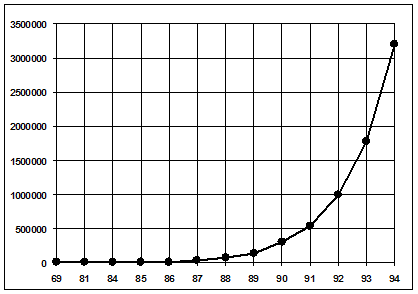 Рис. _________.Ріст числа хостов, підключених до мережі Internet.